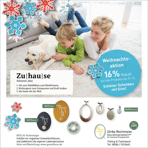Mit der Technologie der RUTLife Produkte kann das Haus, die Wohnung sowie der Schlaf- oder Arbeitsplatz binnen kurzer Zeit von Einflüssen jeglicher Art neutralisiert und harmonisiert werden. So entstehen Orte zum Entspannen, glücklich sein und Kraft tanken. Hier geht es zu den > RUTLife Produkten.